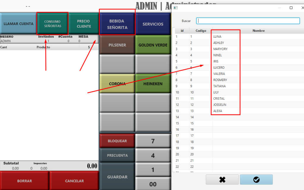 Al momento de marcar una bebida tendrás la opción de seleccionar una señorita, lo cual te permitirá consultar reportes en tiempo real y al final de cada turno.