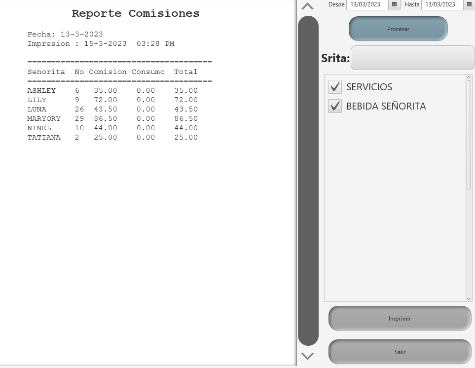 Con el cual podrás, realizar el pago correspondiente de comisiones o porcentaje a cada señorita, así como ver el detalle de consumo de bebidas de cada una de ellas.