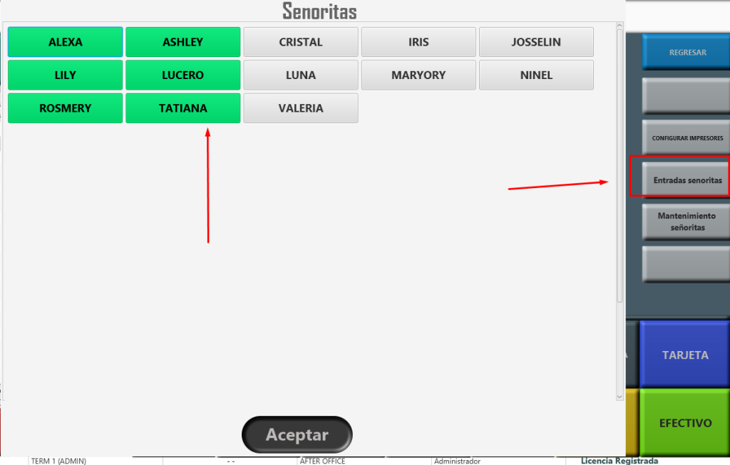 Cada vez que inicies operaciones podrás seleccionar solamente las señoritas que estén activas en el turno, tan solo con un click.